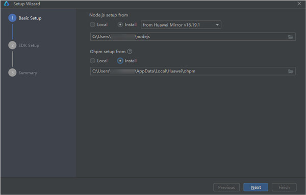 2、安装Node.js与ohpm。可以指定本地已安装的Node.js或ohpm(Node.js版本要求为v14.19.1及以上,且低于v17.0.0;对应的npm版本要求为6.14.16及以上)路径位置;如果本地没有合适的版本,可以选择Install按钮,选择下载源和存储路径后,进行在线下载,单击Next进入下一步。