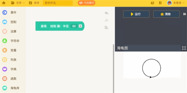 3、从海龟库积木盒拖出积木,点击“运行”,一键绘图。