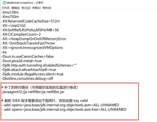 在 idea64.exe.vmoptions 配置文件结尾添加如下配置: