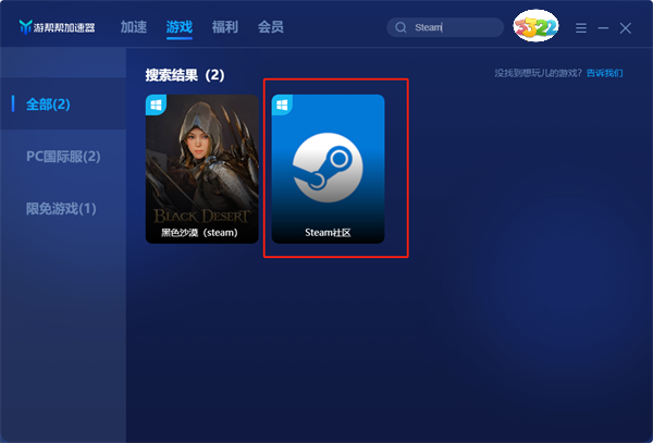 3、在上方游戏搜索框中搜索Steam,选择右面Steam社区的图标点击
