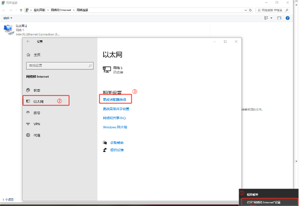 点击任务栏右下角的网络图标,选择“网络和Internet设置”---“以太网”---“更改适配器选项”