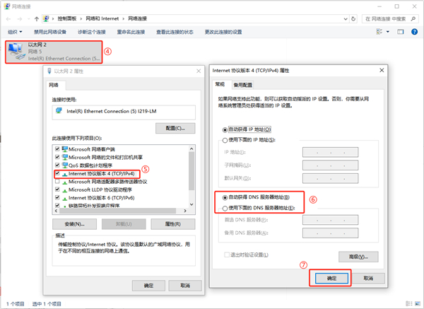 找到并双击“Internet协议版本4 (TCP/IPv4)”(IPv6网络,选择“Internet协议版本6 (TCP/IPv6)”)在弹出的窗口中,选择“自动获得DNS服务器地址”选项后点击确定