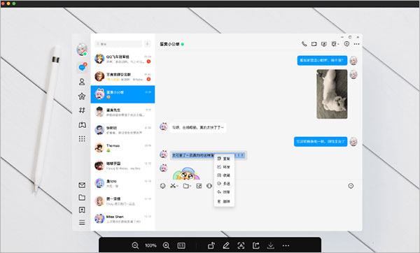 腾讯qq电脑版是腾讯公司为windows操作系统用户精心打造的一款跨平台的即时通讯软件。该软件主要基于QQ NT架构开发,界面设计简洁,能够完美覆盖Microsoft Windows、OS X、Android、iOS、Windows Phone、Linux等多种主流平台,是我们比较常用的社交通讯工具!其内功能丰富,对比移动端,腾讯qq电脑版除了基本的文字语音视频聊天以外,还支持高帧GIF图、视频通话趣味挂件、按区域分享屏幕、全员静音、QQ邮箱等各种功能,可以大大提高用户的互动交流效率!还有三栏式设计的消息界面,可以随时方便用户查看信息。快来腾讯QQ,让心与心的距离更接近吧!