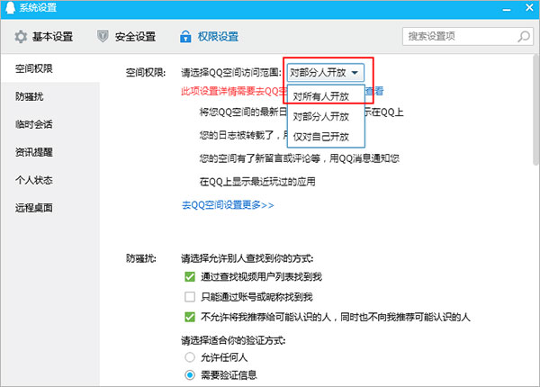 4、点击“小图标”,框内选项可以选择QQ空间访问范围。