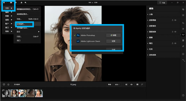1、点击Aperty软件左上角六角星图标,选择文件里的安装插件,将Aperty设置为ps插件。