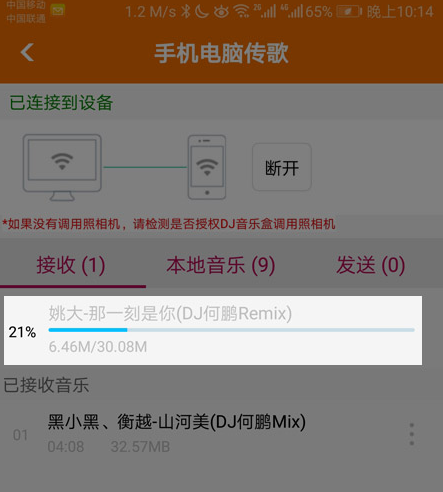 点击传歌后,手机端会自动开始接收传过来的音乐,传完成后就在你手机的本地音乐里。