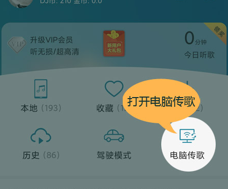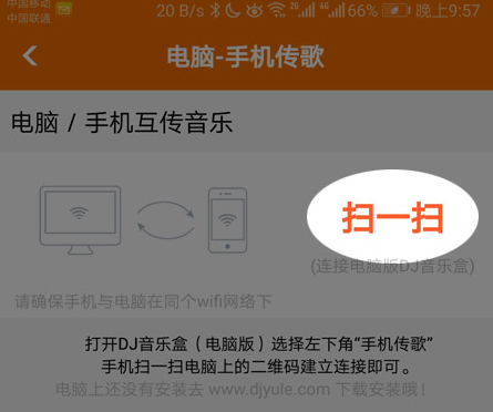 1、打开手机DJ音乐盒APP,电脑传歌(安卓、苹果手机都支持)。