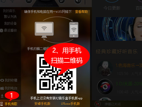 3、打开电脑左下角“手机传歌”用手机扫描二维码。