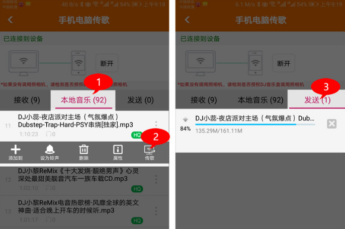 点击手机本地音乐,选择一首音乐后点传歌后,手机中显示正在发送。