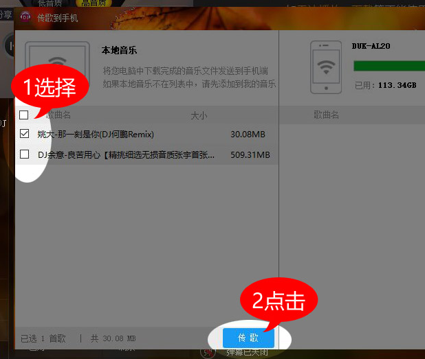 选择电脑本地音乐后,点击 “传歌”。