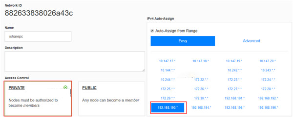 点击你所创建的网络名称进入setting 设置,将网络设置为私有,IPv4 Auto-Assign勾选IP段,比如192.168.193.*