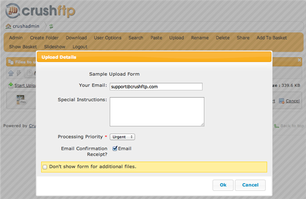 当项目投放到界面上,或使用正常的 "浏览... "方法选择项目时,它们会被添加到上传队列中。如果为用户的上传定义了自定义表单,则会显示该表单,要求用户提供有关上传的其他信息。自定义表单可以按用户定义,功能非常强大和灵活。需要上传附加信息是一种常见需求。