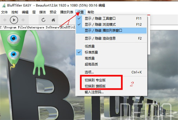 2、双击运行"BluffTitlerPortable.exe"程序直接打开软件,点击SETTINGS-Options,进入到选项界面;