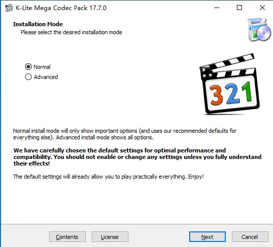 2、K-Lite Mega Codec Pack提供了2种安装模式供用户使用,从上到下为一般模式(Normal)、高级模式(Advanced)根据选择的模式,安装的内容会有较大的区别,越是高等级的模式安装的内容就越多,普通用户选择一般或是高级模式就能几乎满足所有的需要。