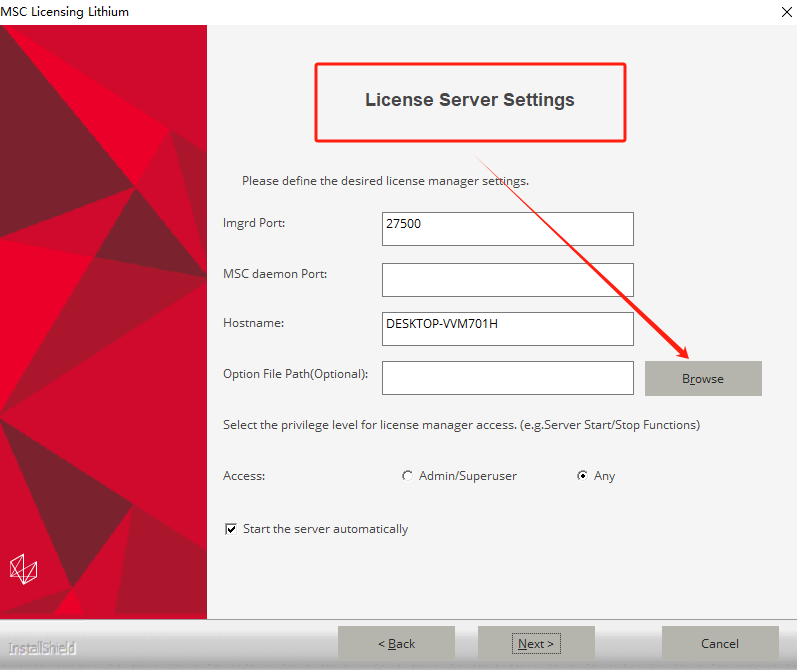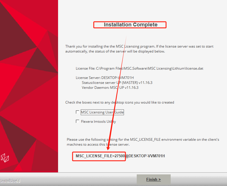 8、继续点击next,出现安装完成界面时,下图这个MSC LICENSE FILE=27500@DESKTOP-VVM701H复制下来,点击finish