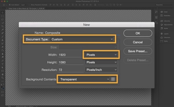在 Photoshop 中选择“File”(文件)>“New”(新建)。选择一个“Document Type”(文档类型),如“Web”(网页)或“Paper”(纸张)。在线使用的图片以像素为单位。打印图片以英寸为单位。将“Background Contents”(背景内容)设置为“Transparent”(透明)。点击“OK”(确定)。