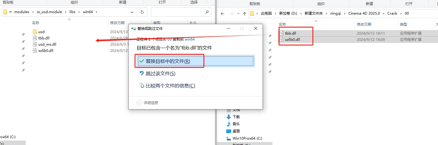 10、将文件夹里面的2个补丁全部复制到刚才安装目录位置打开的win64文件夹下替换。
