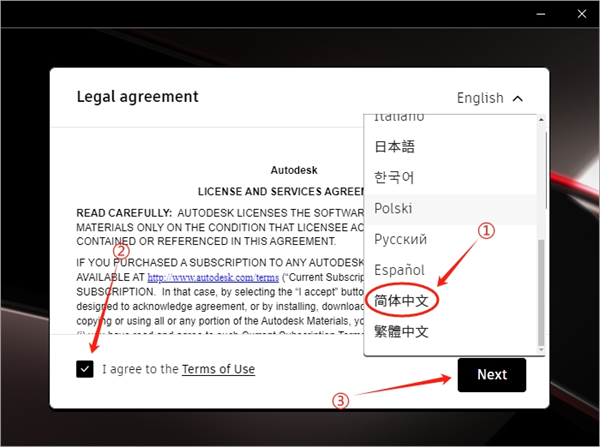 4、选择【简体中文】,勾选软件安装协议,点击【Next】。