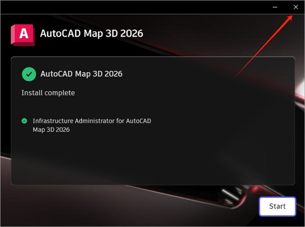 8、AutoCAD Map 3D 2026安装完成,点击【X】关闭,切勿点击【Start】。