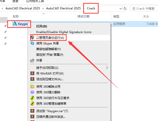 9、打开Crack文件夹,选择Keygen.exe鼠标右键以管理员身份运行。