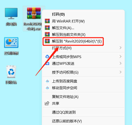 1、右键点击下载的压缩包,选择“解压到 Revit2020(64bit)”;