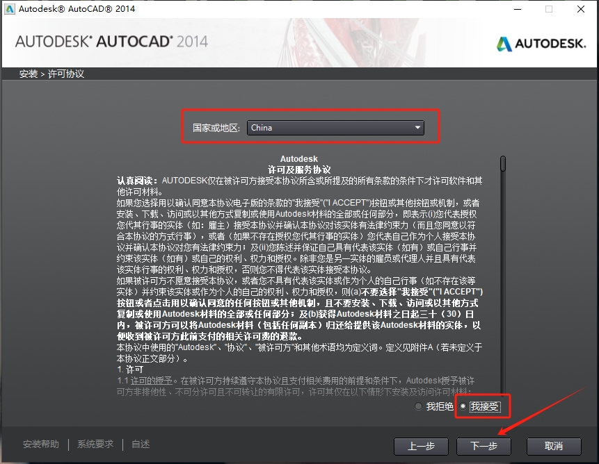 5、在国家或地区中选择China并勾选接受协议,点击【下一步】。