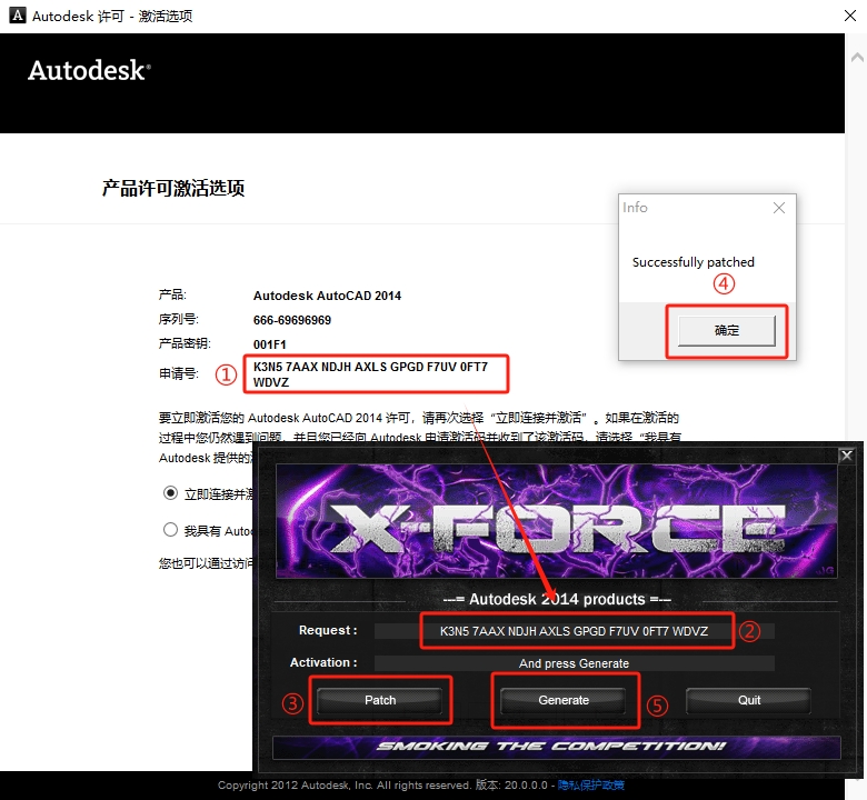 17、首先将【申请号】复制到【Request】框里面,然后点击【Patch】,接着点击【确定】,最后点击【Generate】生成激活码。