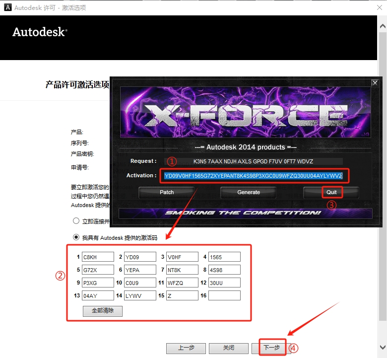 18、将【Activation】框里面的激活码复制到【激活码输入框】中,点击【Quit】,点击【下一步】。