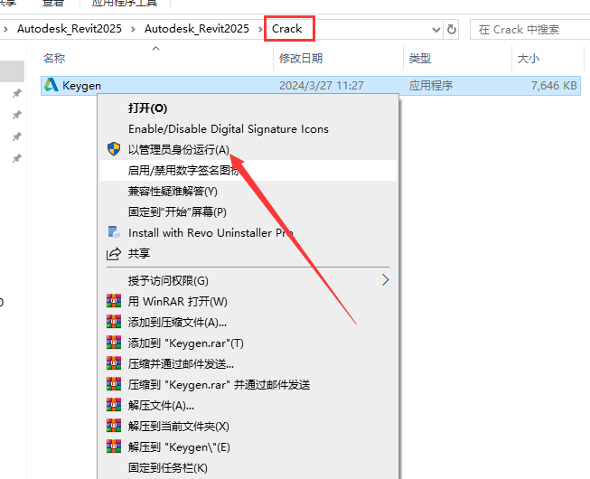 7、打开Crack文件夹,选择注册机Keygen鼠标右键以管理员身份运行。