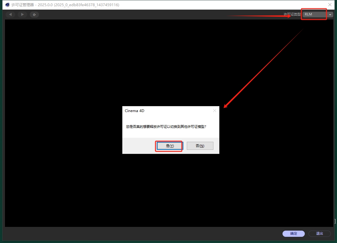 12、打开许可证管理器页面,点击右上角的许可证类型更改为:RLM,然后弹出对话框,点击“是”,再点击退出。重新打开C4d软件(如果重新打开还是出现许可证管理器页面,重复操作几遍)。