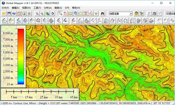 下载的高程数据可在GlobalMapper中打开后提取生成等高线,并可以将生成的等高线导出为SHP、DXF、TAB或KML等几十种矢量数据格式,生成的等高线效果如下图所示