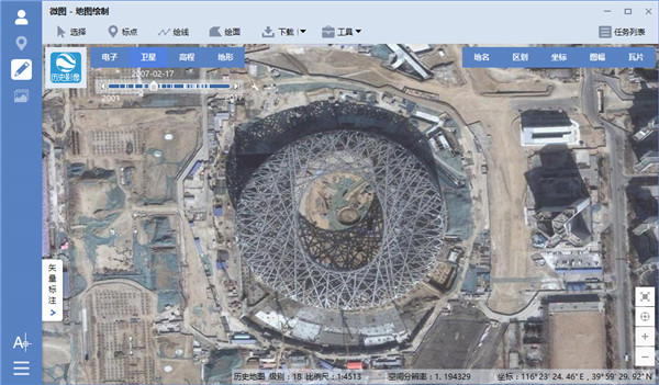 选择历史影像,可以查看谷歌地球的历史影像地图,2007年2月17日世界瞩目的鸟巢建设情况历史影像如下图所示