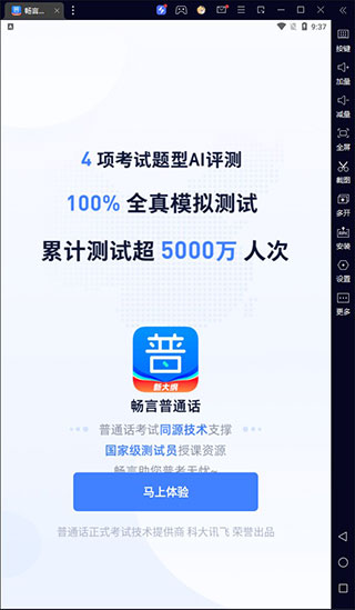畅言普通话电脑版是一款实用的普通话仿真模拟测试软件,专为广大备考全国普通话用户倾力打造。畅言普通话汇聚全国普通话测试,普通话学习、报名、查分等功能于一体,提供普通话考试报名查分、水平模拟测试、学习辅导等一站式普通话测试学习服务。畅言普通话软件操作简单,使用方便,使用国家普通话水平测试系统同款智能语音测评技术,不仅能有效协助每一位报考普通话考试的学生,还可以让考生在线即开展可普话仿真模拟检测,更好的能说出一口流利的普通话。畅言普通话电脑版能够完美运行安卓模拟器,相较于手机版更加方便好用。