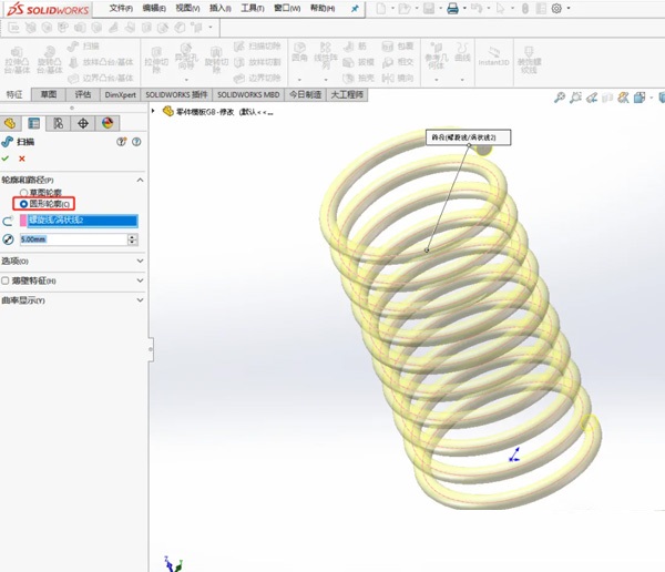 5、最后弹出扫描窗口,点选【圆形轮廓】,路径选择创建的螺旋线,设置圆半径后点击√确认即可。结果如图。