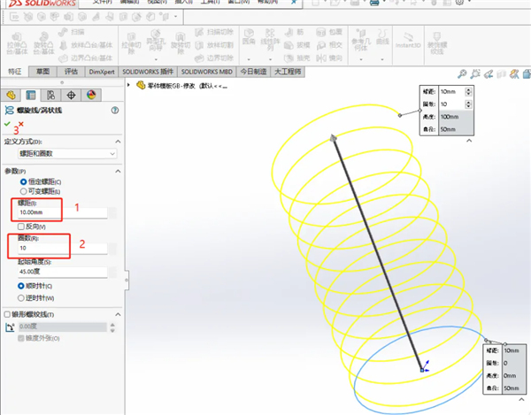 3、弹出螺旋线/涡状线窗口,设置螺距和圈数,完成后点击√确认螺旋线;
