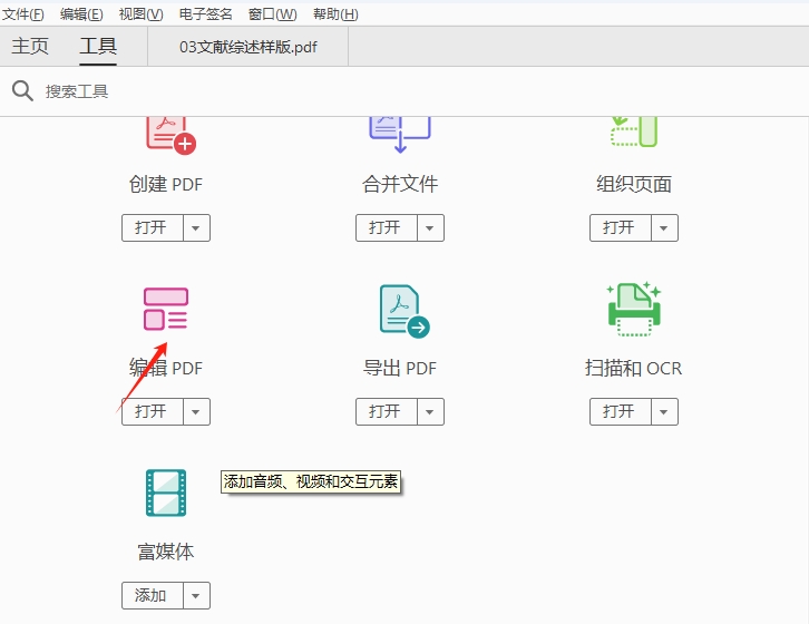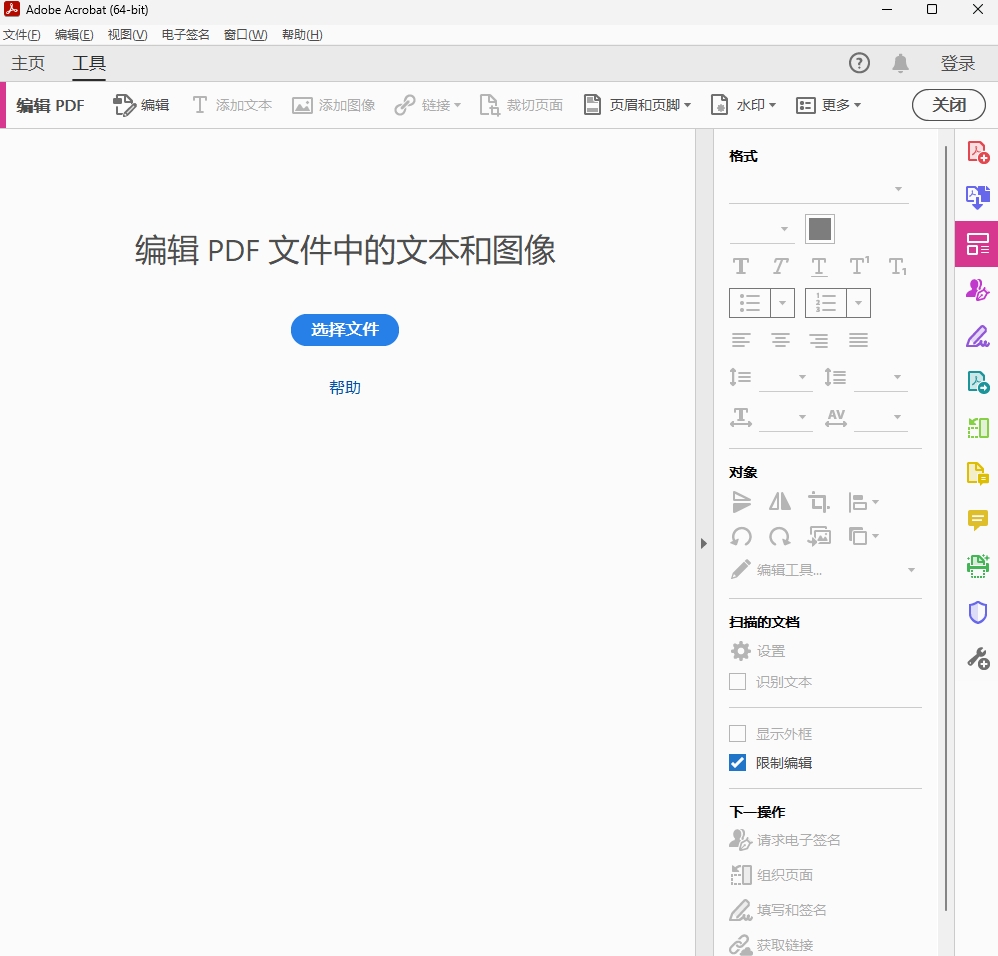 1、在 Acrobat 中打开要编辑的 PDF,然后在全局栏中中选择编辑。