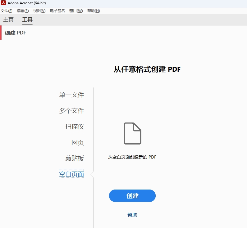 2、此时会打开“创建 PDF”工具。在左侧边栏中,选择空白页面,然后选择创建。
