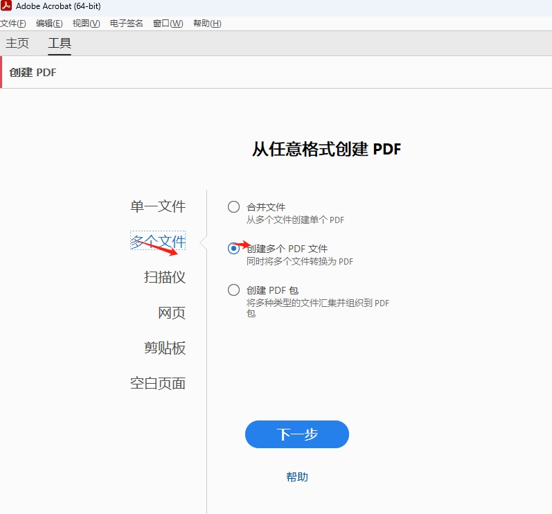 2、此时会打开“创建 PDF”工具。在左侧边栏中,选择多个文件 > 创建多个 PDF 文件,然后选择下一步。