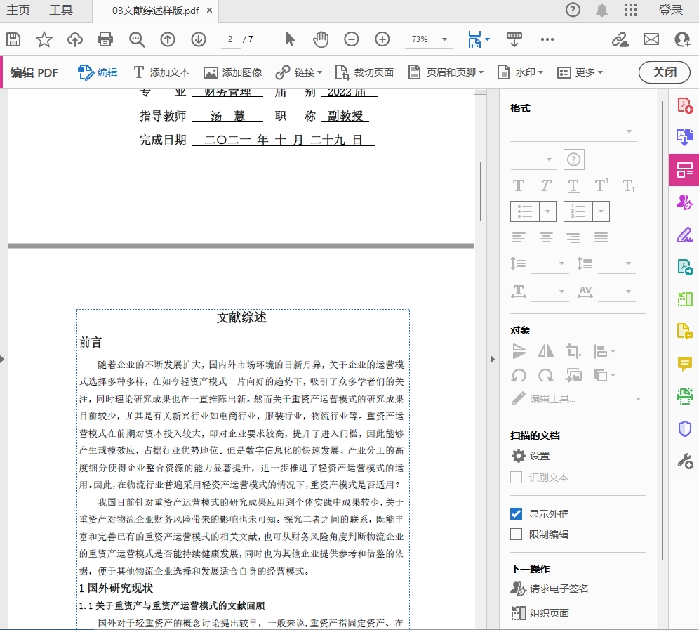 2、PDF将切换到编辑模式,并显示“编辑”面板。如果 PDF 是从扫描文档生成的,Acrobat 会自动运行 OCR 以使文本和图像可编辑。