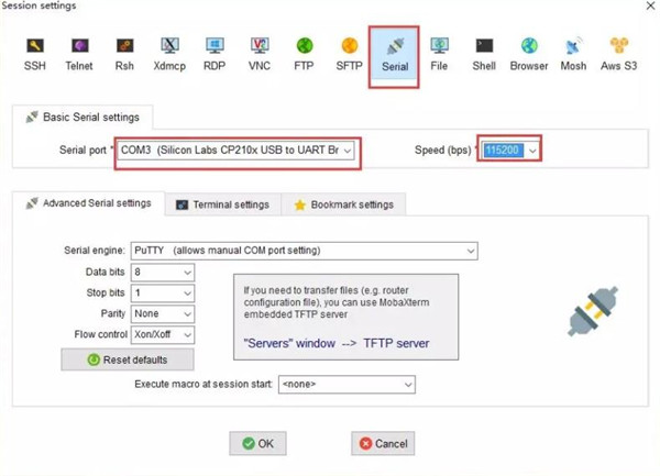 如同上面步骤,在「session setting」 对话框里选择serial,再选好串口号及波特率,点击OK就完成连接了。同样session会保存在左侧的session标签页里,方便下次连接
