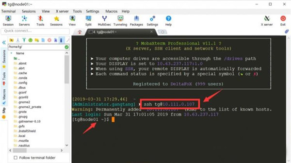 登陆后界面主要分两块,左边的是主机的文件,右边是终端。勾选左下角的 “Follow terminal folder” 可以让两个的工作路径保持一致