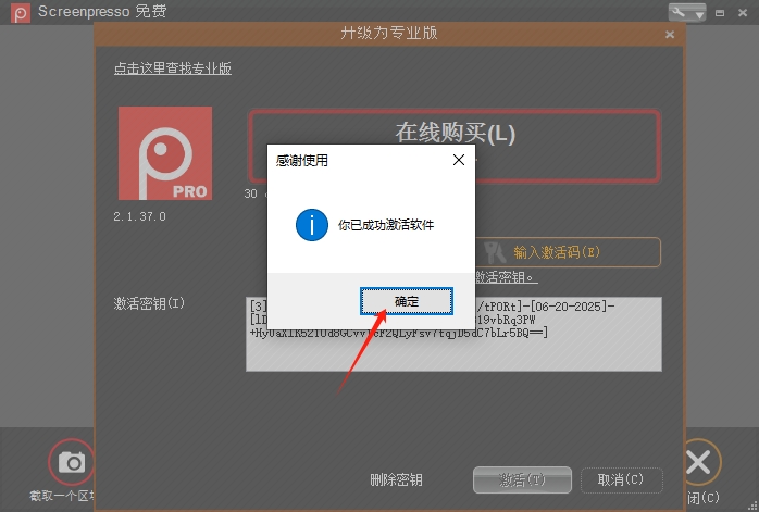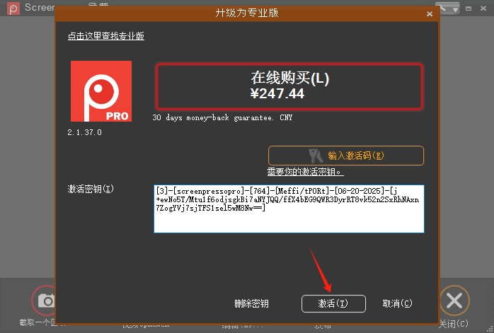 11、将激活码粘贴至【激活密钥】中,点击【激活】。