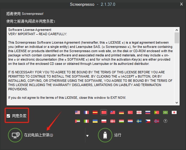 2、进入软件安装界面,勾选【同意条款】,点击【在此电脑上安装】。
