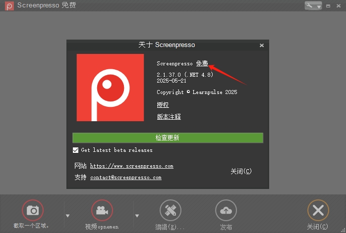 ScreenPresso Pro是一款截屏录屏工具,它能够完整的捕获您的桌面,包括屏幕截图以及高清视频,你可以使用它用于您的演示文稿以及培训文档,协作设计工作以及错误报告等。ScreenPresso Pro还可以基于图像和注释生成PDF,Microsoft Word(DOCX)或HTML文档,此功能非常适合在几分钟之内快速生成用户手册,培训甚至是学习资料!此外,ScreenPresso Pro是一款飞航轻量级的截图工具,小小的身体却内置了功能强大的图像编辑器,可以非常方便后期编辑图像,并提供共享选项。