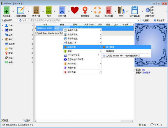 2、在主界面列表中找到刚添加的书籍(这里是【道德经】),选择并右击该书籍,在下拉列表中点击【转换书籍】—【逐个转换】。