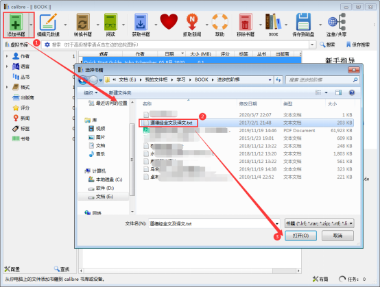 1、用户安装之后弹出Calibre软件,点击左上角【添加书籍】,然后会弹出浏览窗口,从本地硬盘中选择要转化的书籍,比如这里选择【道德经】,然后点击【打开】,这样选择书籍就会导入到主界面列表中。