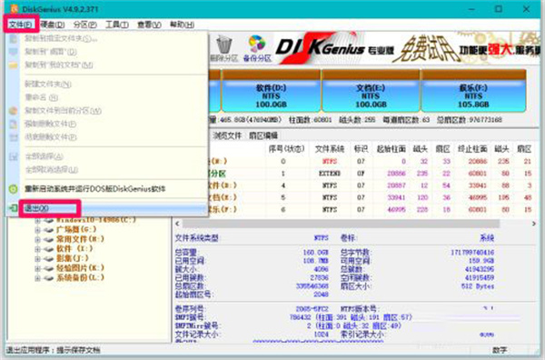 6、点击窗口左上角的【文件】,在下拉菜单中点击【退出】,退出DiskGenius软件程序。