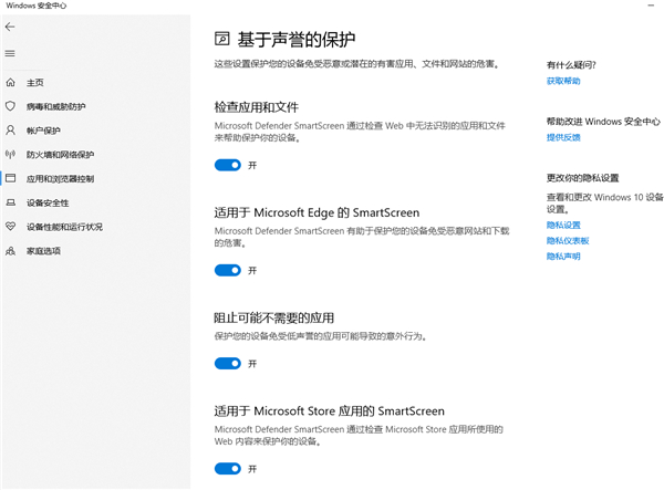 然后继续点击左侧 → 应用和浏览器控制 → 基于声誉的保护设置 → 所有通通关掉下拉到底全部关掉