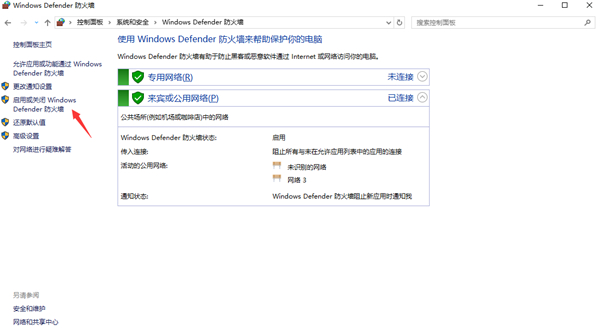 打开它之后,就可以看到目前电脑系统的防火墙是处于打开的状态,然后点击左侧的“启用或关闭Windows Defender防火墙”选项