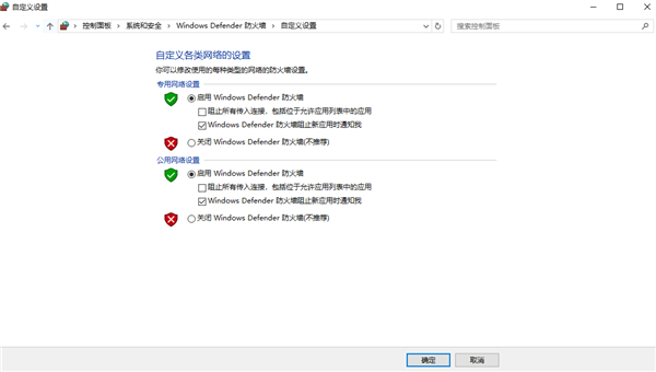 都改成“关闭Windows Defender防火墙”,最后点击“确定”